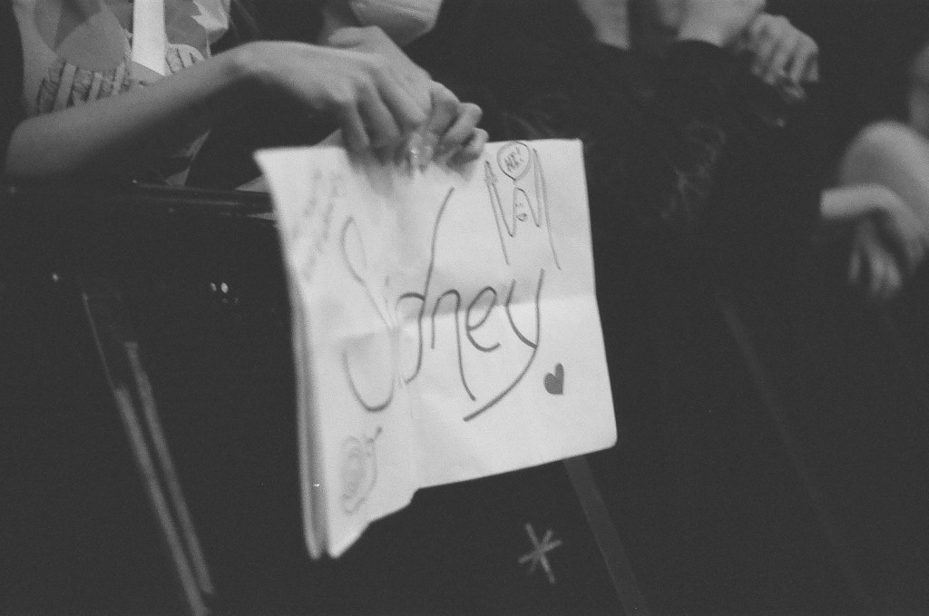 With the crowd fully energized, patient fans waited for Sidney Gish to appear, including one with a homemade sign and another couple in matching newly bought merch.